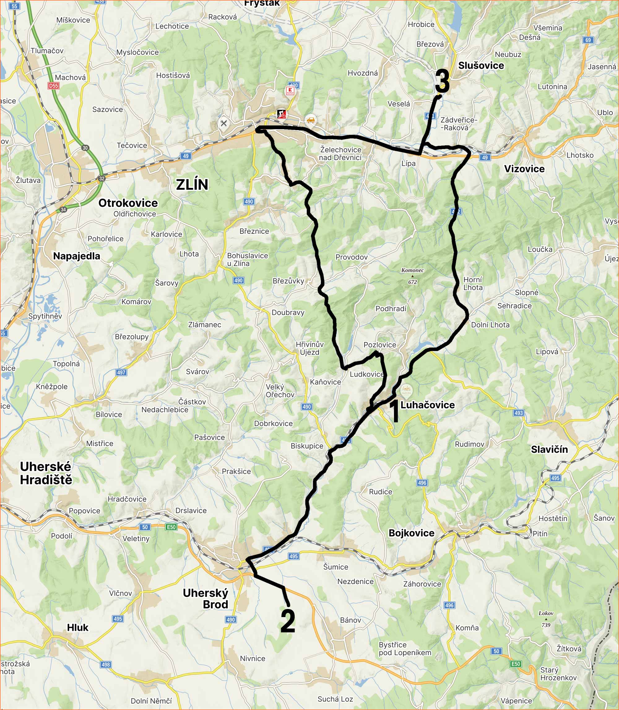 Po včerejšku to bude jenom skok. Potřebujeme objednat dřevo a při posledním objednávání po telefonu vznikl problém dvou objednávek. Takže jedu zjistit přesné místo, kde to je a zrovna si to objednat. Protože po včerejšku mám prázdnou nádrž, zastavuji se v Luhačovicích (1). Do nádrže dávám jen 5 litrů, nechci na servis mít plnou. Kousek za Uherským Brodem najíždím do bývalého JZD Králov (2) a hledám, kde se vlastně nachází kancelář. Zastavuji u stavební buňky, kde mě vítá nádherný Německý ovčák, až potom majitel. Domlouvám s ním objednávku a vydávám se do MCF Slušovice na domluvení servisu po 12000km. Cesta je na pohodu, ani se mi nechce moc předjíždět. Na prodejně si domluvím přivezení SUMOKI na čtvrtek, zítra ji chci dát koupel, abych se za ní nemusel stydět. Potom už jenom domů. 93km